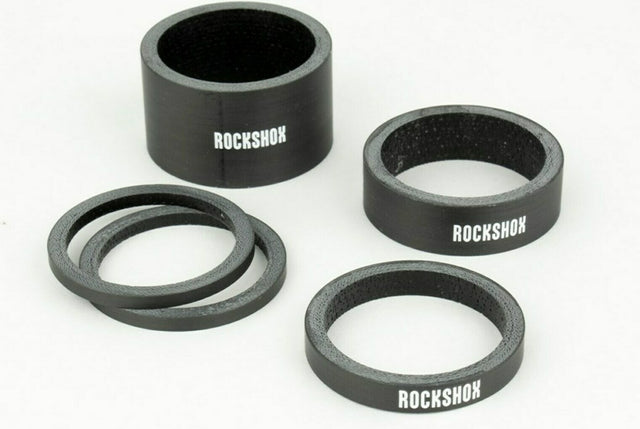 The RockShox UD Carbon Headset Spacer Set is a lightweight and durable carbon headset spacer that allows for precise adjustment of the cockpit height to the rider's preference. Crafted from high-quality carbon fiber (UD Carbon) , they provide maximum stiffness and a sleek look , while the glossy white RockShox logo adds a stylish touch.